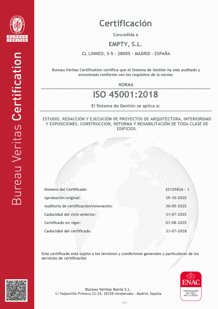 EMPTY SL dedica su actividad al estudio, redacción y ejecución de proyectos singulares de arquitectura, especialmente en los ámbitos de la museografía, la rehabilitación y el interiorismo. Para llevar a cabo su actividad con las máximas garantías, EMPTY SL cuenta con una política integrada de calidad, medio ambiente y seguridad y salud en el trabajo, que se concreta en los siguientes puntos: